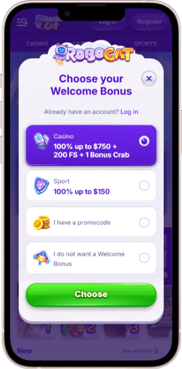 - Choose one of the two RoboCat welcome bonus offers that we have for you. You can also opt not to participate in the promotion.